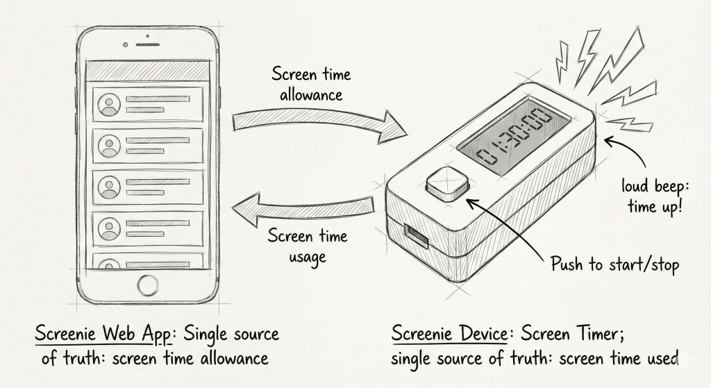 - The child carries around a tiny device that records their screen time. One simple button to start/stop the timer.