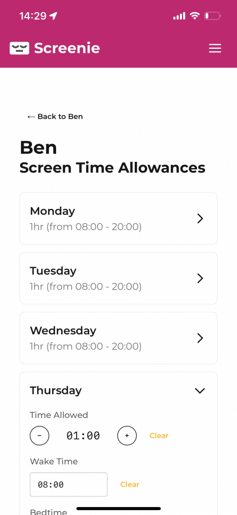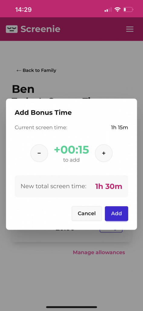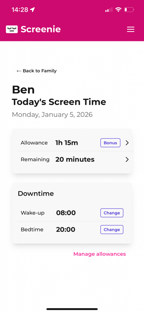 - Create screen time allowances (weekdays, weekends, etc) and bonus time capability